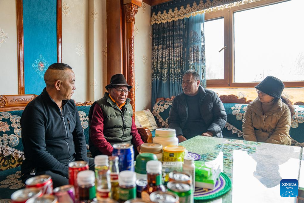 Losang (2nd L) talks with his son and neighbors at home in Doilungdeqen District of Lhasa, southwest China's Xizang Autonomous Region, March 20, 2025. (Xinhua/Tenzin Nyida)
