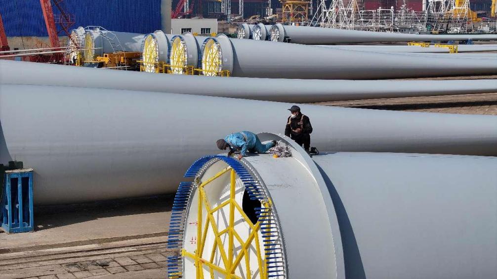 Workers assemble a massive wind turbine blade at a marine wind power industrial base in Rongcheng city, east China's Shandong province. (People's Daily Online/Yang Zhili)