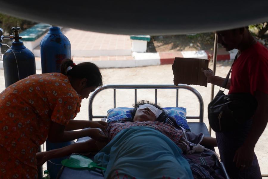 A woman injured in an earthquake receives medical treatment in a tent at a hospital in Nay Pyi Taw, Myanmar, March 31, 2025. (Photo by Wang Shen/Xinhua)
