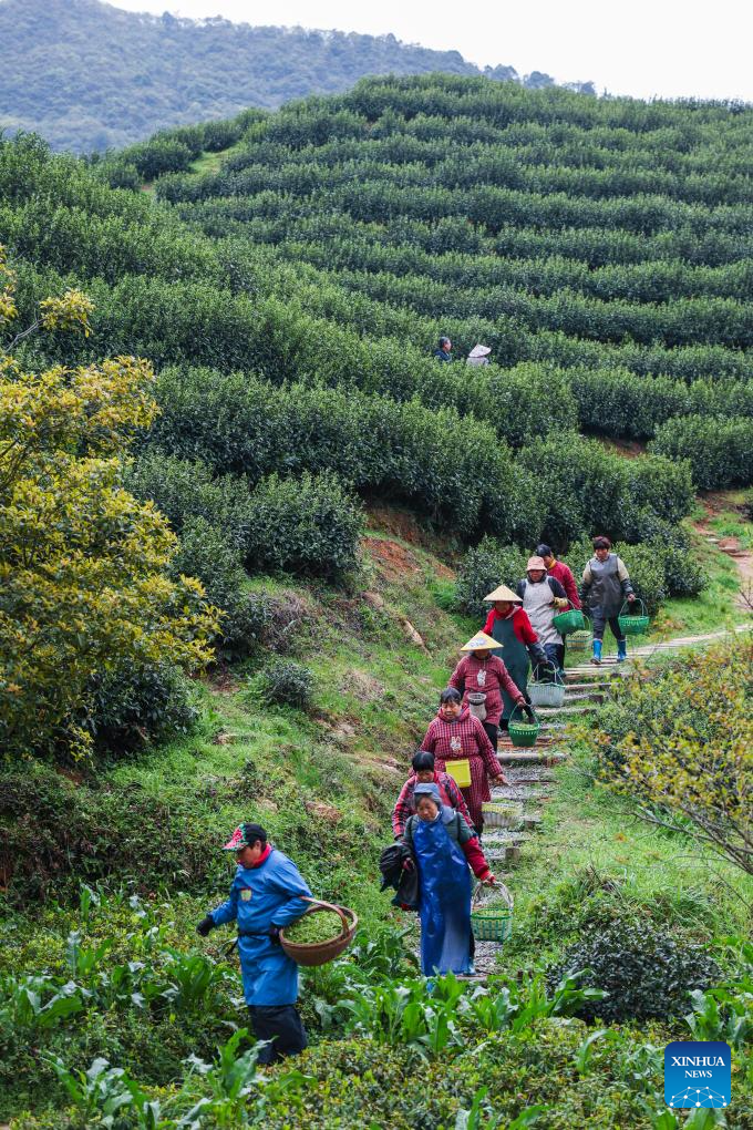 Farmers pick Juyan tea leaves at a planting base in Lutian Village in Jinhua City of east China's Zhejiang Province, March 31, 2025. The Wuzhou (ancient name of Jinhua) Juyan tea has recently entered its harvest season. The making technique of the Juyan tea, together with that of Longjing tea (West Lake Dragon Well tea), Changxing Zisun tea (a tea variety originated from Changxing County) and some other reputed tea varieties in Zhejiang, was inscribed on the World Intangible Cultural Heritage List in 2022.