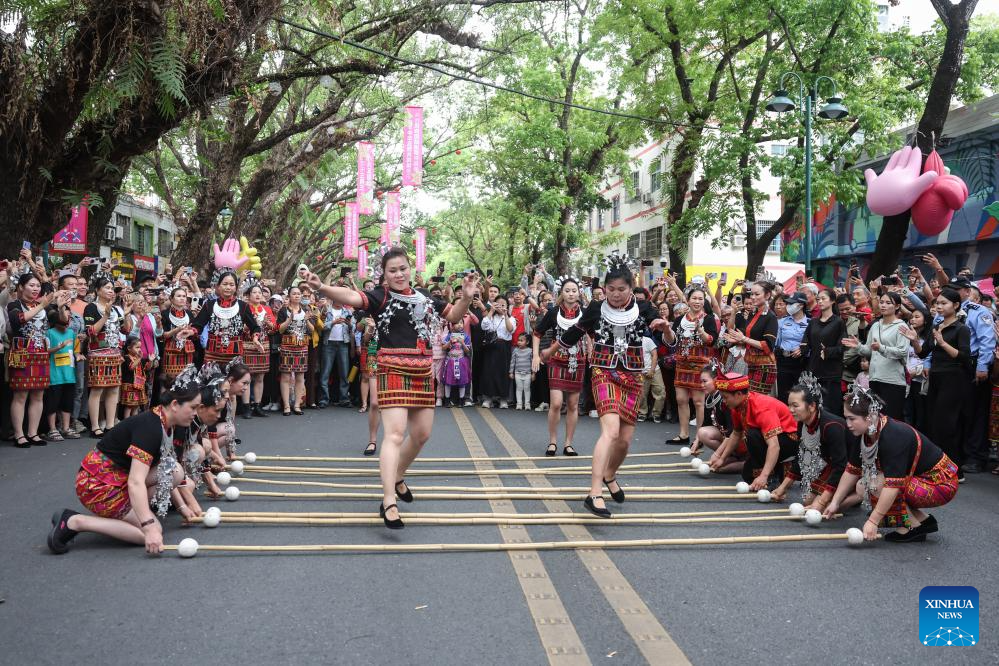 People perform the bamboo dance during a Sanyuesan celebration in Wuzhishan City of south China's Hainan Province, March 31, 2025. Local people held various events in Wuzhishan to celebrate the Sanyuesan Festival which falls on the third day of the third lunar month. (Xinhua/Zhang Liyun)