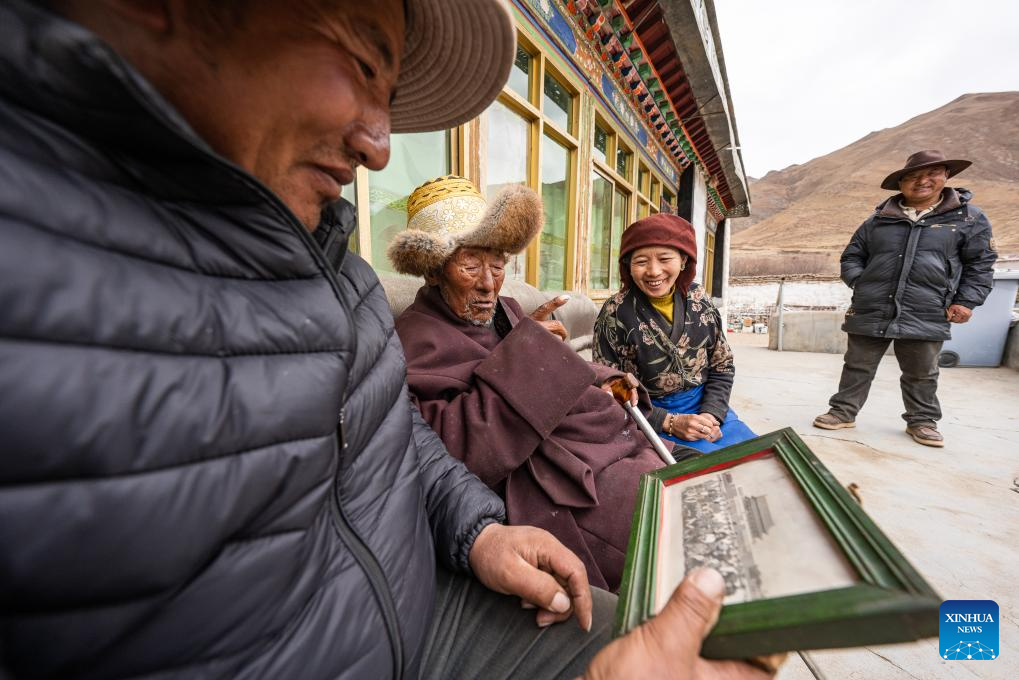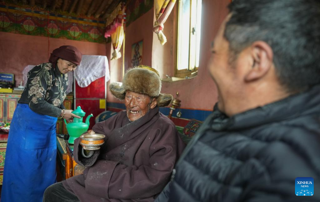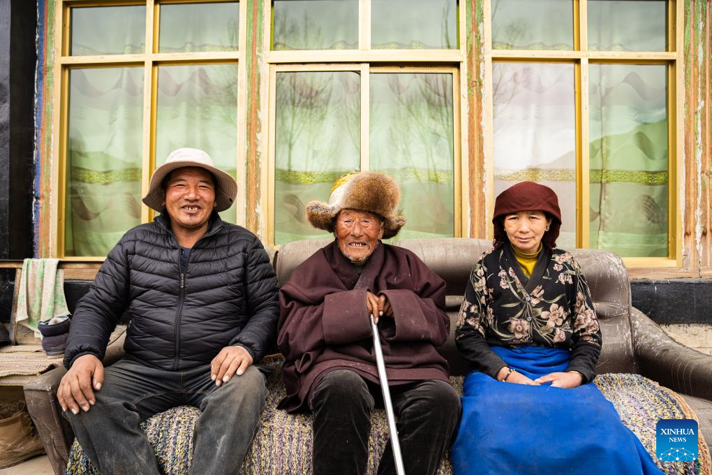 Sonam Tashi (C) chats with family members in Chubzang village of Doilungdeqen District in Lhasa, southwest China's Xizang Autonomous Region, March 20, 2025. (Xinhua/Jigme Dorje)