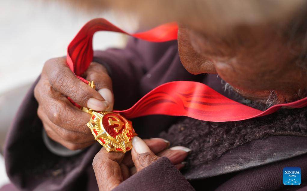 Sonam Tashi looks at a commemorative medal awarded to him after 50 years of Communist Party of China membership in Chubzang village of Doilungdeqen District in Lhasa, southwest China's Xizang Autonomous Region, March 20, 2025. (Xinhua/Jigme Dorje)