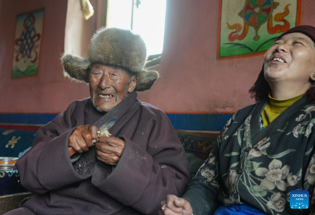 Sonam Tashi (L) enjoys food with a family member in Chubzang village of Doilungdeqen District in Lhasa, southwest China's Xizang Autonomous Region, March 20, 2025. (Xinhua/Jigme Dorje)