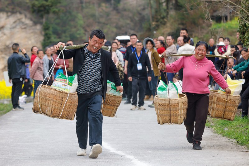 Participants compete in a grain-carrying relay race using shoulder poles in Shibing county, Qiandongnan Miao and Dong Autonomous Prefecture, southwest China's Guizhou Province. (Photo/Mo Guibin)