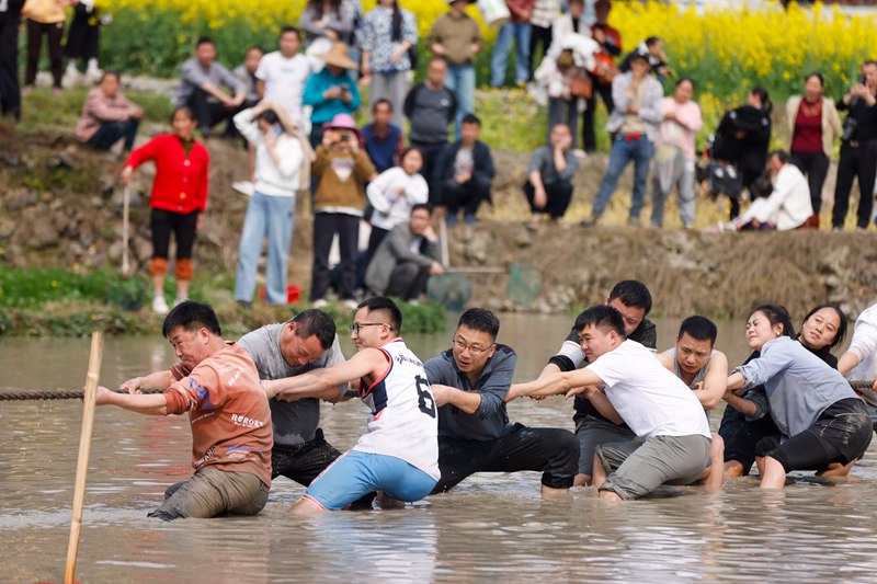 Participants engage in a tug-of-war game in a rice paddy in Shibing county, Qiandongnan Miao and Dong Autonomous Prefecture, southwest China's Guizhou Province. (Photo/Mo Guibin)