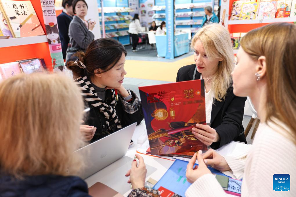 Exhibitors talk at the Chinese exhibition area during the 62nd Bologna International Children's Book Fair in Bologna, Italy, April 1, 2025. The book fair opened on Monday in the Italian city of Bologna, with China hosting a series of events to promote its literature for young readers on the global stage. (Xinhua/Li Jing)