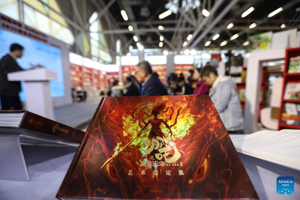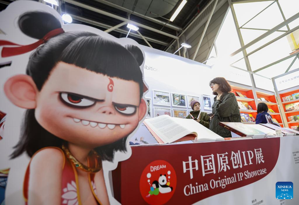 This photo taken on April 1, 2025 shows books themed in Ne Zha, a rebellious boy-god from Chinese folklore, at the Chinese exhibition area during the 62nd Bologna International Children's Book Fair in Bologna, Italy. The book fair opened on Monday in the Italian city of Bologna, with China hosting a series of events to promote its literature for young readers on the global stage. (Xinhua/Li Jing)