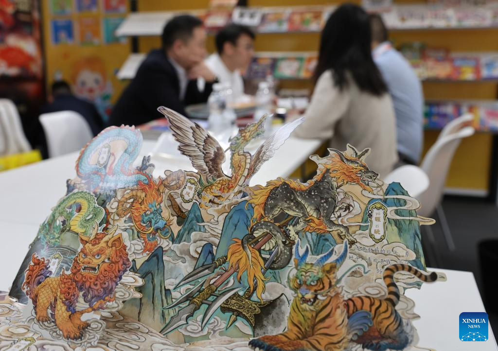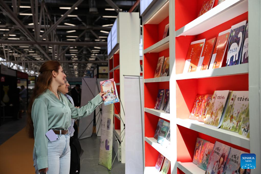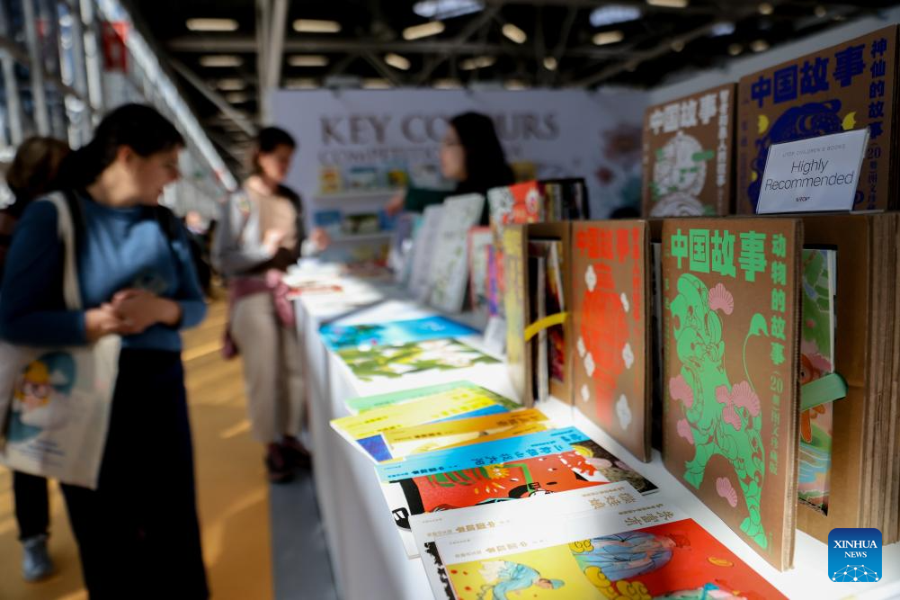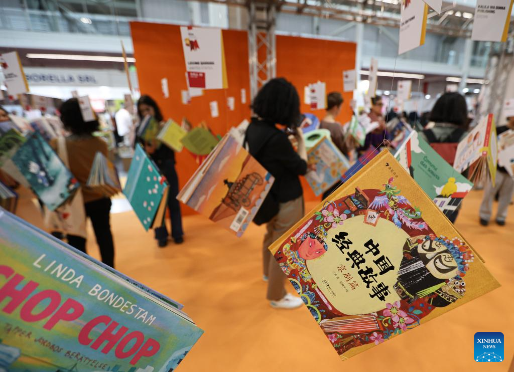 Children's books are displayed during the 62nd Bologna International Children's Book Fair in Bologna, Italy, April 1, 2025. The book fair opened on Monday in the Italian city of Bologna, with China hosting a series of events to promote its literature for young readers on the global stage. (Xinhua/Li Jing)