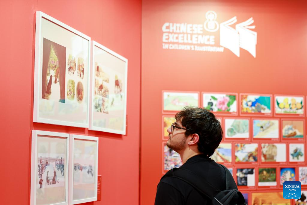 A man looks at the works of Chinese illustrators during the 62nd Bologna International Children's Book Fair in Bologna, Italy, April 1, 2025. The book fair opened on Monday in the Italian city of Bologna, with China hosting a series of events to promote its literature for young readers on the global stage. (Xinhua/Li Jing)
