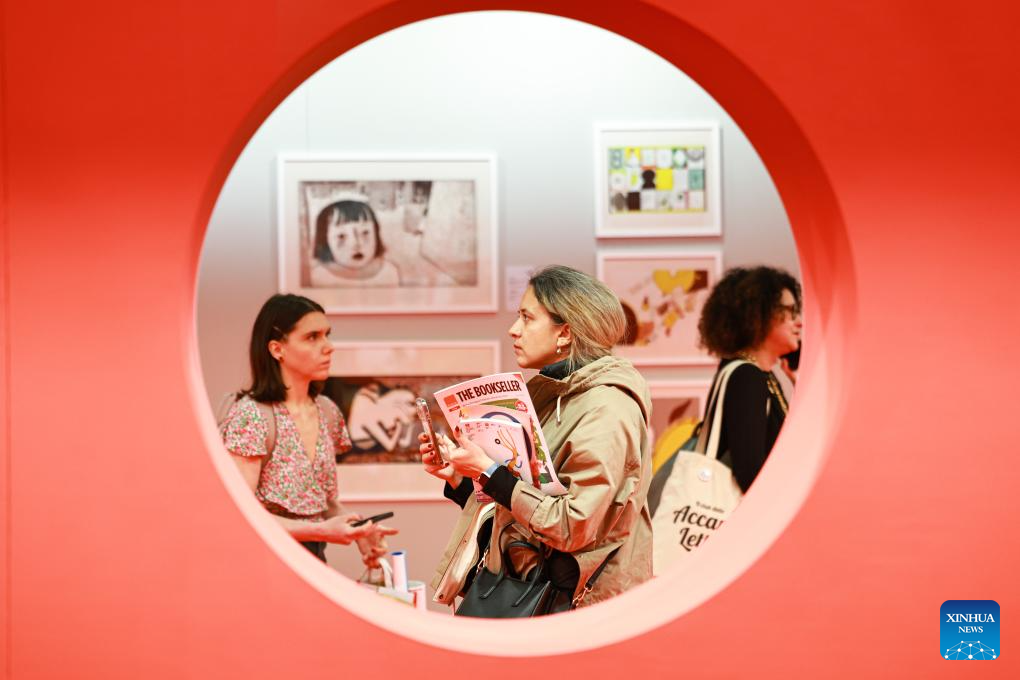 People look at the works of Chinese illustrators during the 62nd Bologna International Children's Book Fair in Bologna, Italy, April 1, 2025. The book fair opened on Monday in the Italian city of Bologna, with China hosting a series of events to promote its literature for young readers on the global stage. (Xinhua/Li Jing)