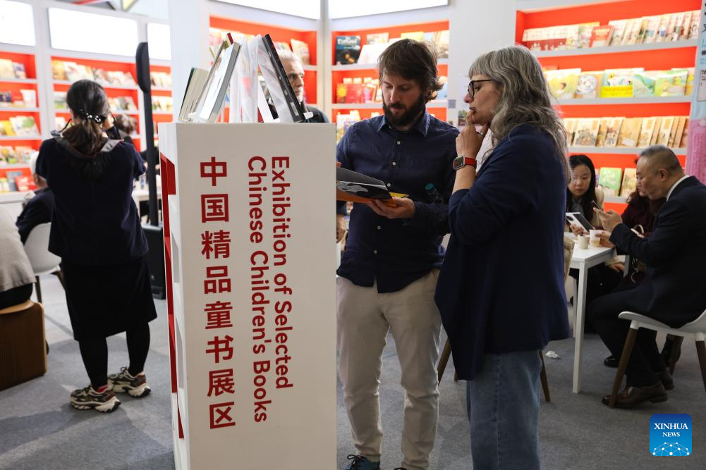 People read books at the Chinese exhibition area during the 62nd Bologna International Children's Book Fair in Bologna, Italy, April 1, 2025. The book fair opened on Monday in the Italian city of Bologna, with China hosting a series of events to promote its literature for young readers on the global stage. (Xinhua/Li Jing)