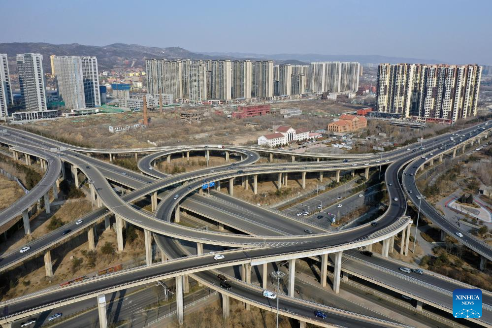 An aerial drone photo taken on Feb. 19, 2025 shows cars running on an interchange in Jinyuan District of Taiyuan City, north China's Shanxi Province.