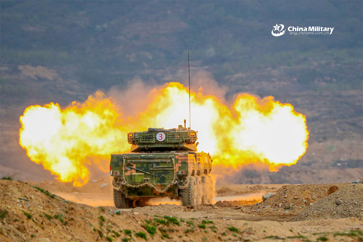 An infantry fighting vehicle (IFV) attached to a combined-arms brigade under the Chinese PLA 72nd Group Army fires at the mock target during a day-and-night training exercise in early March, 2025.(eng.chinamil.com.cn/Zhang Mao)