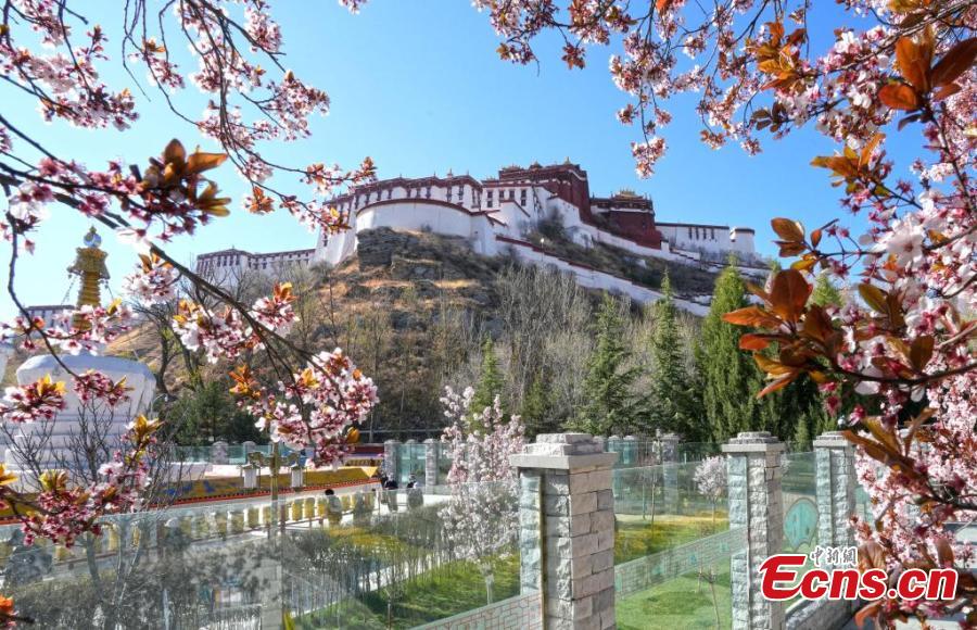 Potala Palace is surrounded by blooming flowers as spring comes in Lhasa, Southwest China's Xizang Autonomous Region, April 1, 2024. (China News Service/Li Lin)