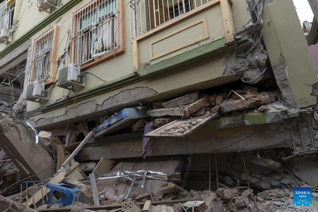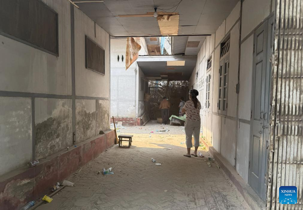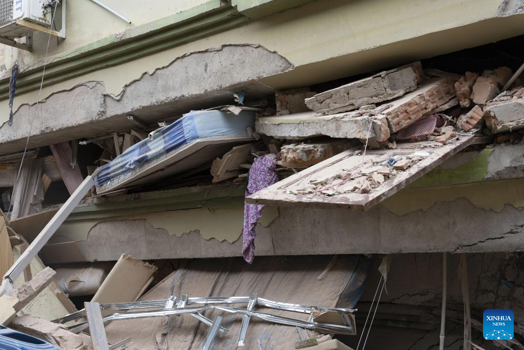 This photo shows the collapsed home of a missing child named Shin Shin at the Sky Villa residence in Mandalay, Myanmar, April 1, 2025. China Search and Rescue Team, assigned by the country's Ministry of Emergency Management, and a rescue team from China's Hong Kong carried out a joint search and rescue operation for a missing child named Shin Shin at the Sky Villa residence on Tuesday. The 5-year-old girl has been missing since the earthquake last week. (Xinhua/Cai Yang)