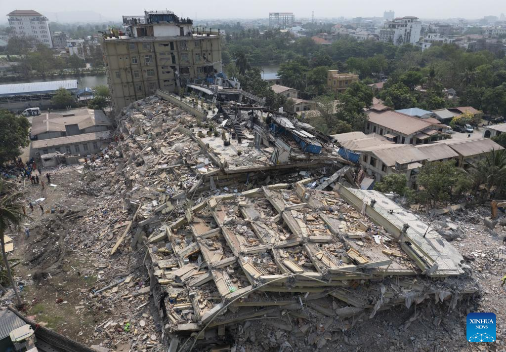 An aerial drone photo shows the collapsed Sky Villa residence in Mandalay, Myanmar, April 1, 2025. China Search and Rescue Team, assigned by the country's Ministry of Emergency Management, and a rescue team from China's Hong Kong carried out a joint search and rescue operation for a missing child named Shin Shin at the Sky Villa residence on Tuesday. The 5-year-old girl has been missing since the earthquake last week. (Xinhua/Cai Yang)