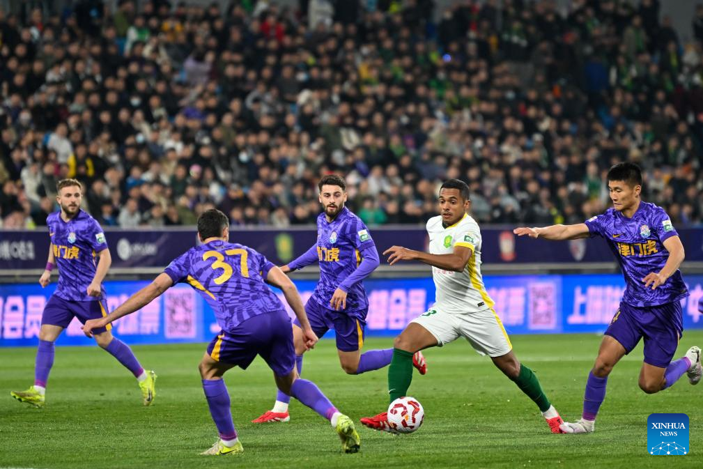 Dawhan (2nd R) of Beijing Guoan competes during the 4th round match between Tianjin Jinmen Tiger and Beijing Guoan at the 2025 season Chinese Football Super League (CSL) in north China's Tianjin, April 2, 2025. (Xinhua/Sun Fanyue)