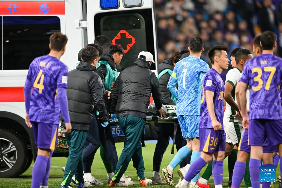 Staff carry Uros Spajic of Beijing Guoan to an ambulance during the 4th round match between Tianjin Jinmen Tiger and Beijing Guoan at the 2025 season Chinese Football Super League (CSL) in north China's Tianjin, April 2, 2025. (Xinhua/Sun Fanyue)