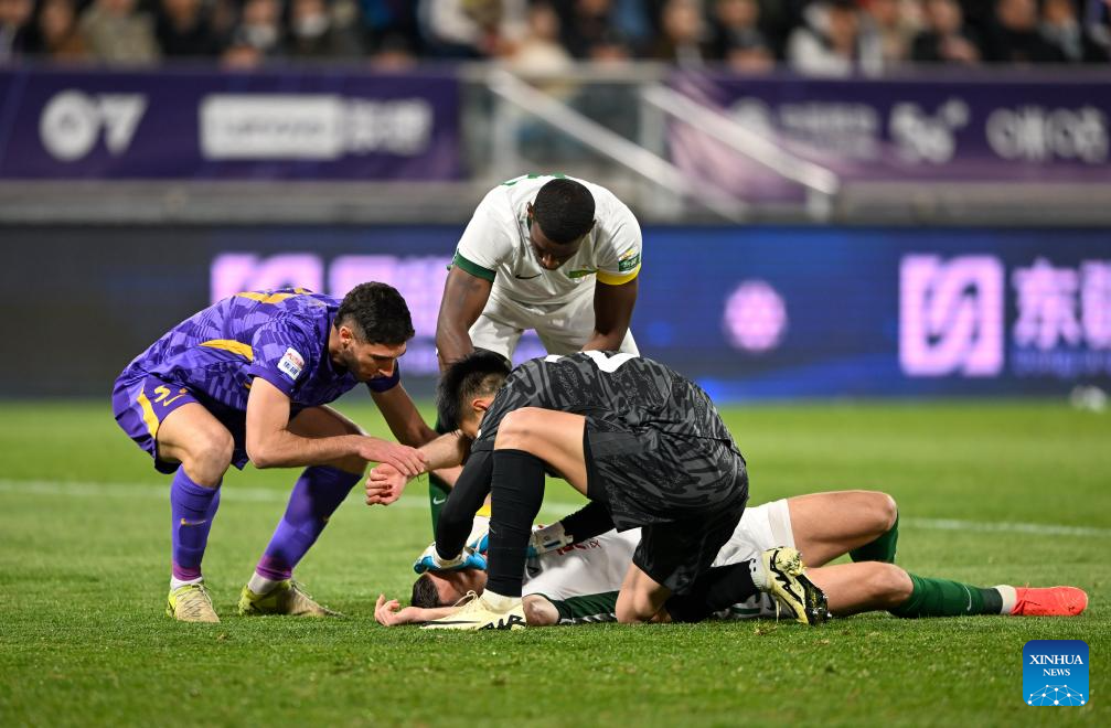 Uros Spajic (bottom) of Beijing Guoan loses consciousness during the 4th round match between Tianjin Jinmen Tiger and Beijing Guoan at the 2025 season Chinese Football Super League (CSL) in north China's Tianjin, April 2, 2025. (Xinhua/Sun Fanyue)