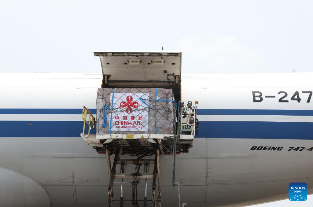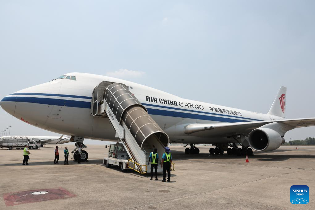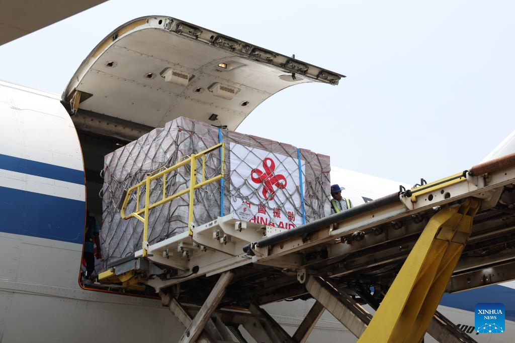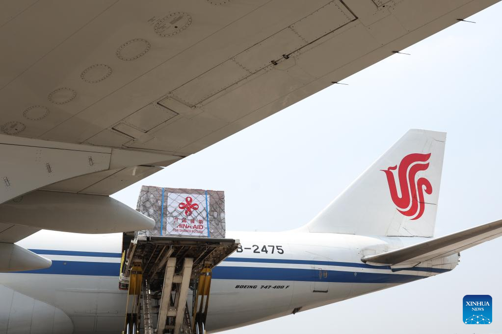 The second batch of emergency humanitarian aid supplies dispatched by the Chinese government arrives at Yangon International Airport in Yangon, Myanmar, April 3, 2025. (Xinhua/Jia Haocheng)