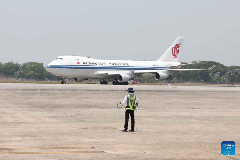 The second batch of emergency humanitarian aid supplies for earthquake disaster relief dispatched by the Chinese government arrives at Yangon International Airport in Yangon, Myanmar, April 3, 2025. (Xinhua/Jia Haocheng)
