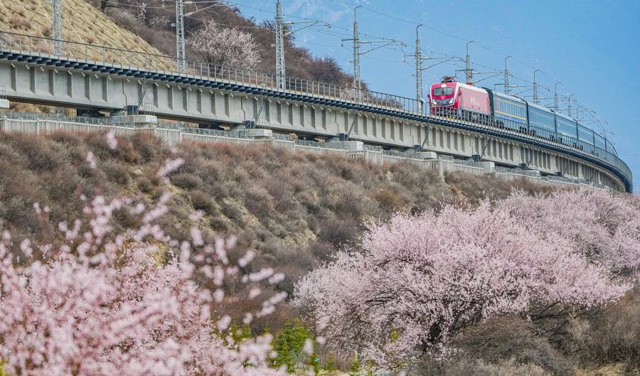 A train runs on the Nyingchi section of Lhasa-Nyingchi railway in southwest China's Xizang Autonomous Region, April 1, 2025. (Xinhua/Tenzin Nyida)
