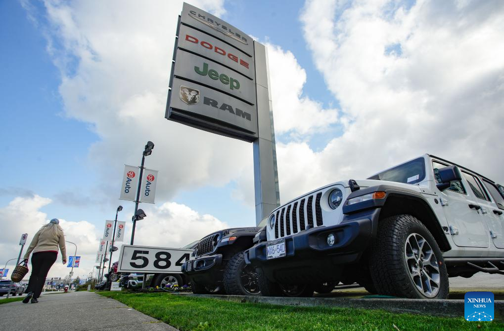 New vehicles are on display at a car dealership in Vancouver, British Columbia, Canada, on April 3, 2025. Canadian Prime Minister Mark Carney announced on Thursday Canada will be responding by matching the U.S. approach with 25 percent tariffs on all vehicles imported from the United States that are not compliant with the Canada-U.S.-Mexico Agreement (CUSMA). (Photo by Liang Sen/Xinhua)