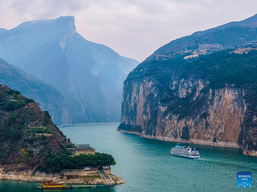 An aerial drone photo shows ships sailing in Qutang Gorge, one of the Three Gorges on the Yangtze River, in Fengjie County, southwest China's Chongqing Municipality, Dec. 19, 2024. With a history of over 2,300 years, Fengjie, a county in Chongqing where the Kuimen gateway to the magnificent gorges of the Yangtze River is located, gained its reputation as the "city of poetry," as poets, military figures and politicians in history wrote extensively about the forbidding landscape of rapid currents and narrow waterways.