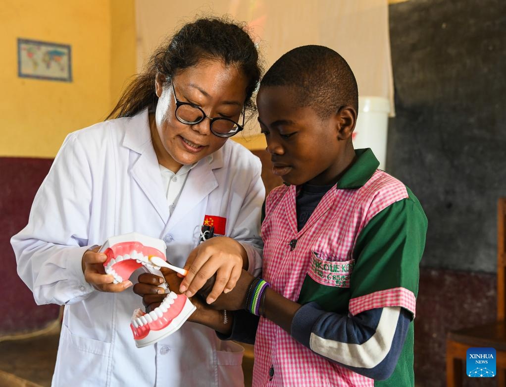 A Chinese doctor teaches a student of a primary school to brush teeth correctly in Mbalmayo, Cameroon, on April 3, 2025. A Chinese medical team working in Cameroon on Thursday provided free health care services to a primary school in Mbalmayo. The free health care services, including dental checks, health counseling and a lecture on infectious disease prevention, benefited over 80 students and teachers of the school. (Xinhua/Kepseu)
