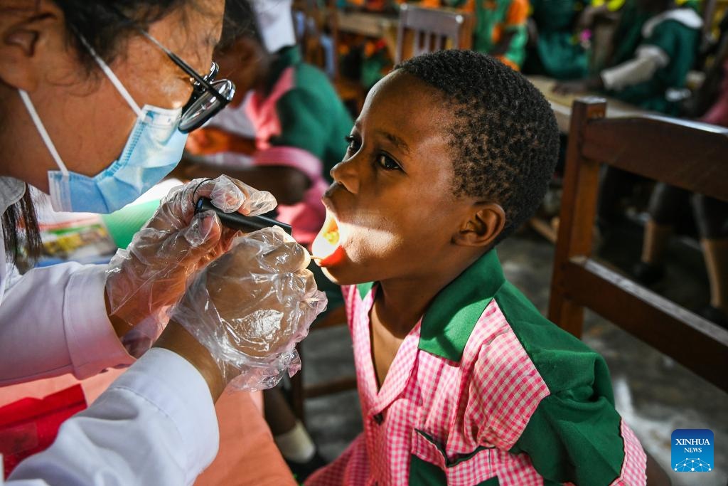 A Chinese doctor does a dental check for a student of a primary school in Mbalmayo, Cameroon, on April 3, 2025. A Chinese medical team working in Cameroon on Thursday provided free health care services to a primary school in Mbalmayo.