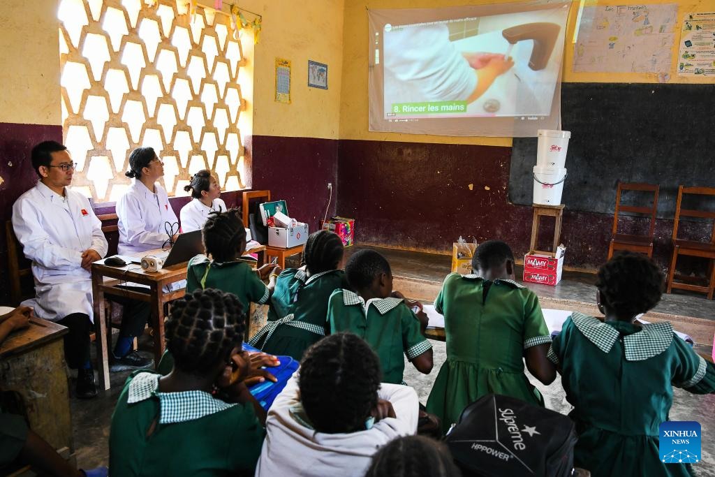 Chinese doctors make a lecture on infectious disease prevention for students of a primary school in Mbalmayo, Cameroon, on April 3, 2025. A Chinese medical team working in Cameroon on Thursday provided free health care services to a primary school in Mbalmayo.