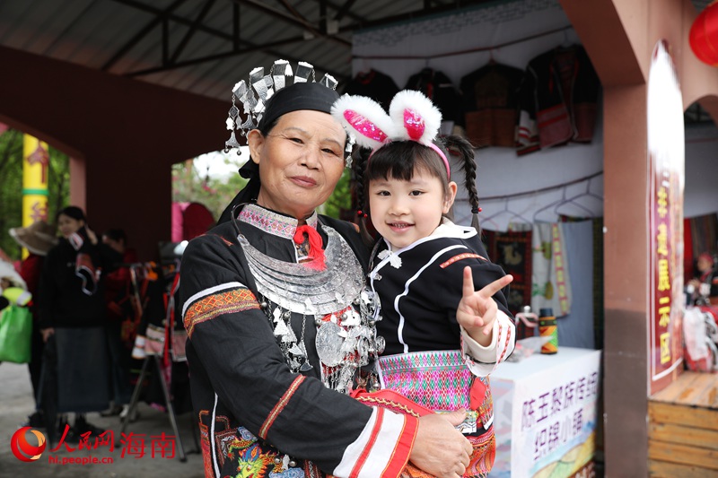 People dressed in Li brocade clothing pose for photos during a celebration of the Sanyuesan Festival, which falls on the third day of the third lunar month, in Qiongzhong city, south China's Hainan Province, March 30, 2025. (People's Daily Online/Fu Wuping)