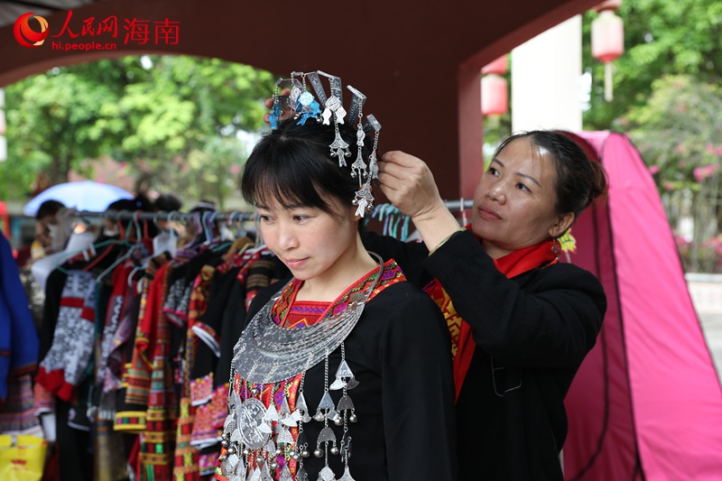 A tourist is adorned in traditional Li ethnic clothing and headwear during a celebration of the Sanyuesan Festival, which falls on the third day of the third lunar month, in Qiongzhong city, south China's Hainan Province, March 30, 2025. (People's Daily Online/Fu Wuping)