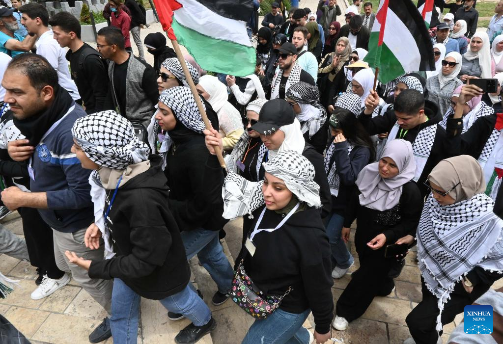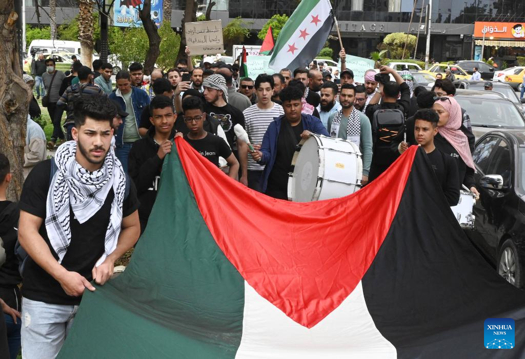 People take part in a protest against ongoing Israeli assaults on the Gaza Strip, in downtown Damascus, Syria, on April 7, 2025. (Photo by Ammar Safarjalani/Xinhua)