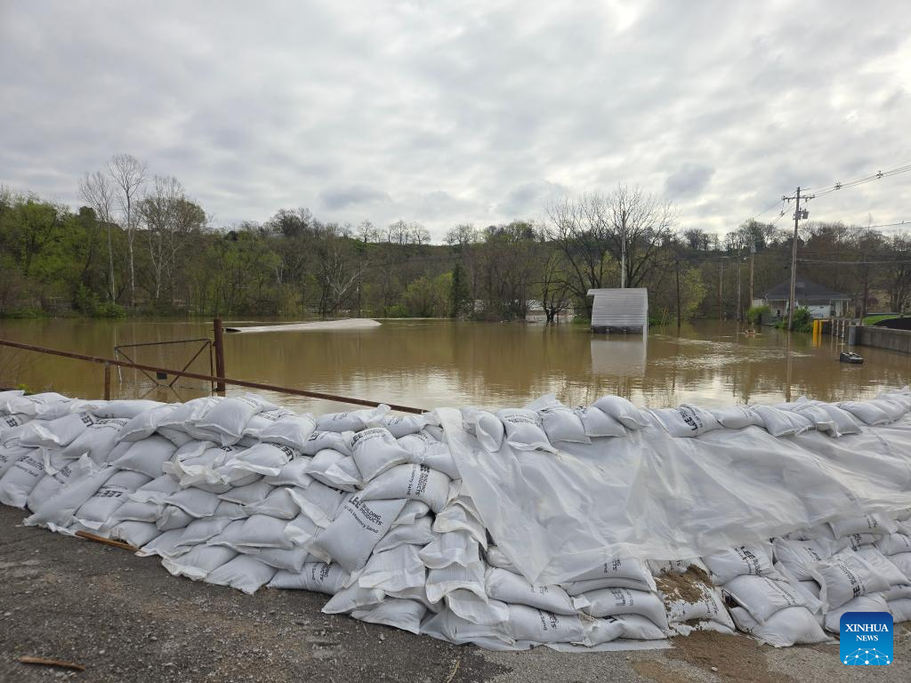 Photo taken on April 7, 2025 shows sandbags piled around a waterlogged area in Frankfort, Kentucky, the United States. (Photo by Wang Changzheng/Xinhua)
