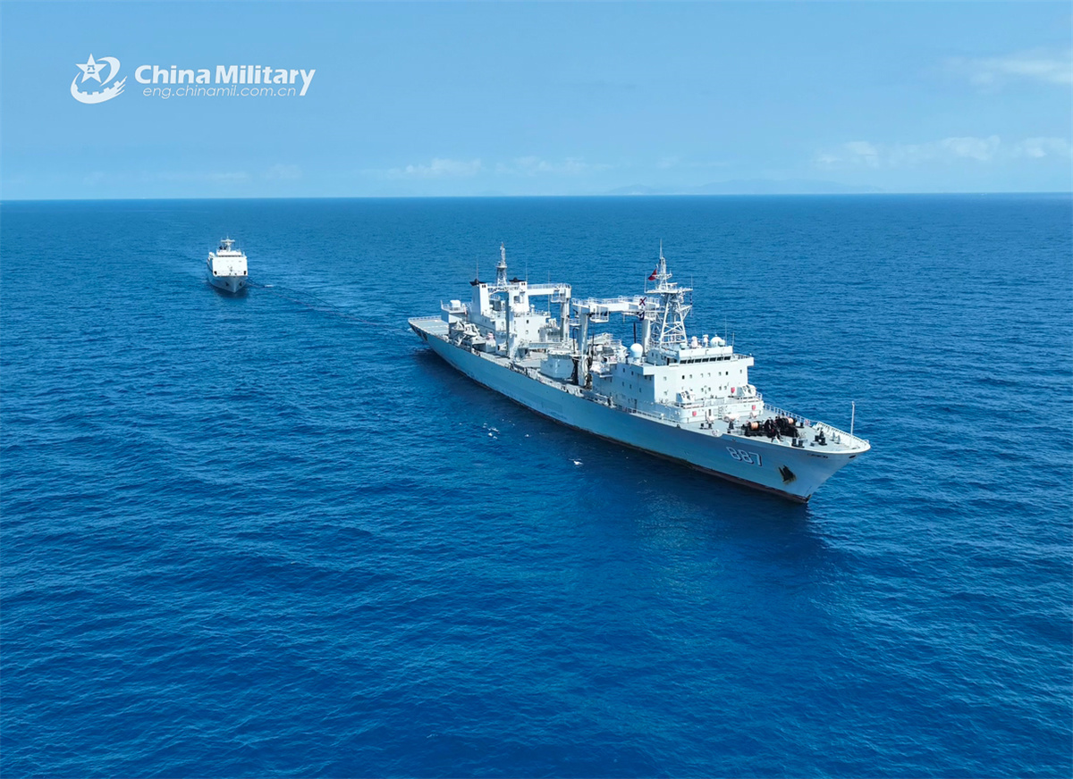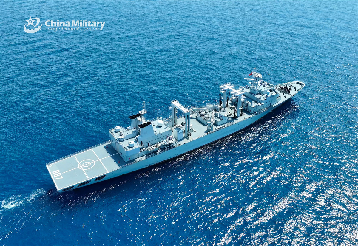 Comprehensive supply ship Weishanhu (Hull 887), attached to a naval service group under the Chinese PLA Southern Theater Command, steams at sea during a recent maritime maneuver and replenishment training exercise in the South China Sea. (eng.chinamil.com.cn/Photo by Wu Huanqing)