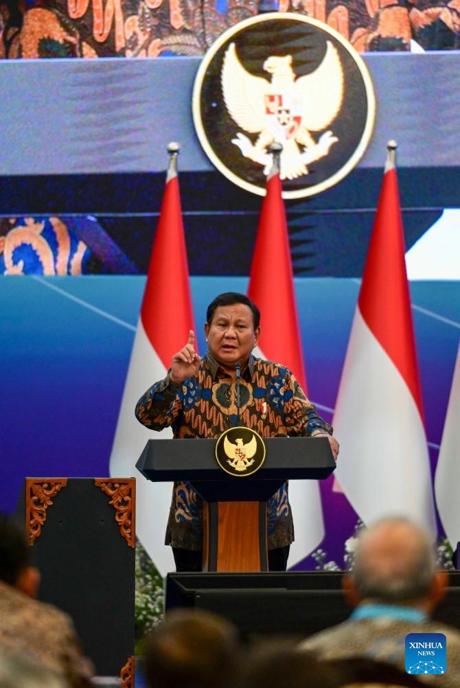 Indonesian President Prabowo Subianto speaks during an economic discussion attended by cabinet members and business leaders in Jakarta, Indonesia, April 8, 2025. (Xinhua/Zulkarnain)