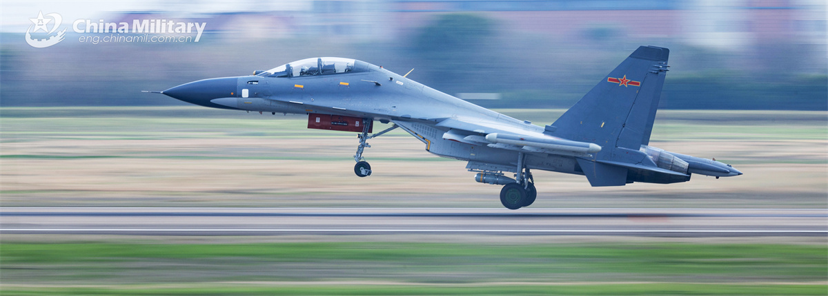 A Su-30 fighter jet attached to an aviation brigade of the Chinese PLA Air Force takes off in speed during a flight training exercise on March 26, 2025. (eng.chinamil.com.cn/Huang Guotai)