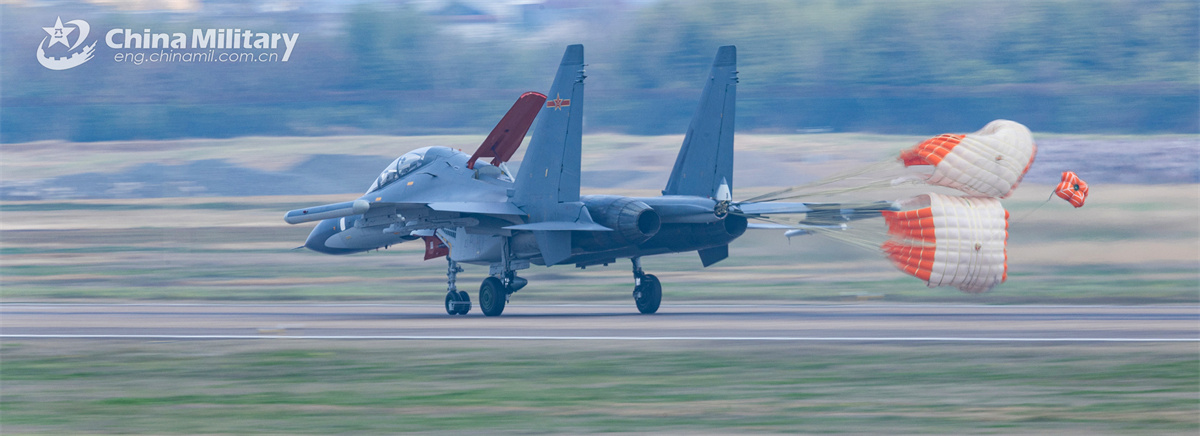 A Su-30 fighter jet attached to an aviation brigade of the Chinese PLA Air Force releases its drag chute to slow down after landing during a flight training exercise on March 26, 2025. (eng.chinamil.com.cn/Huang Guotai)