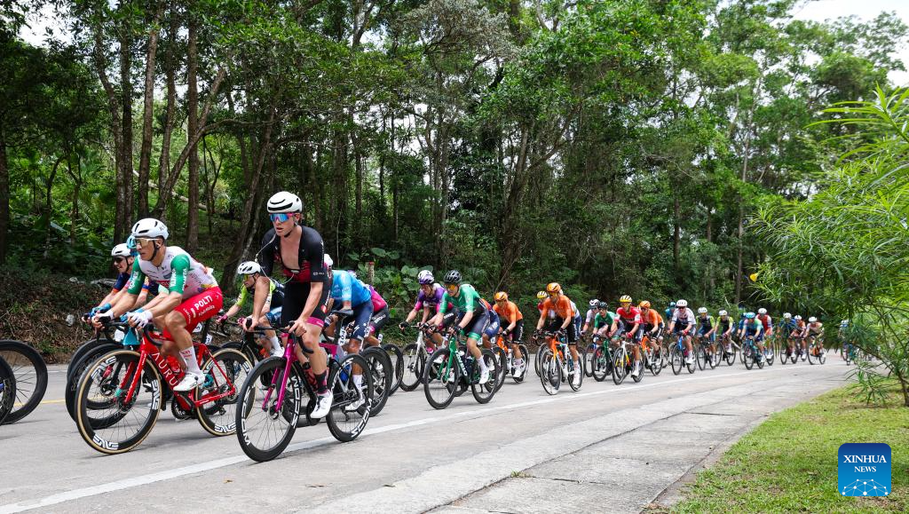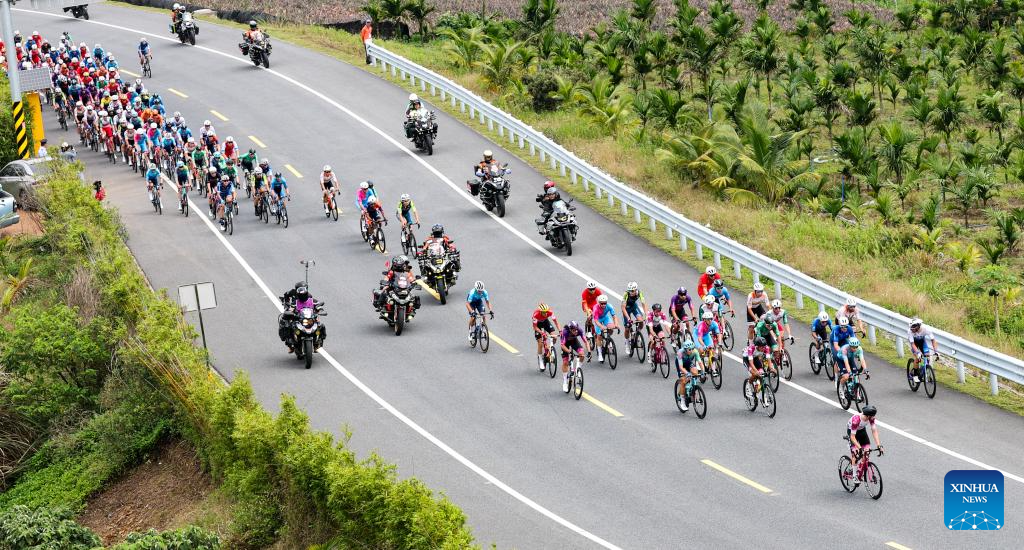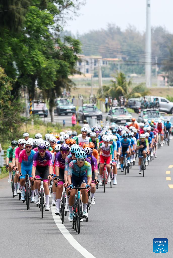 Cyclists compete during Stage 2 at the 16th Tour of Hainan cycling race from Qionghai to Lingshui, south China's Hainan Province, April 8, 2025. (Xinhua/Yang Guanyu)