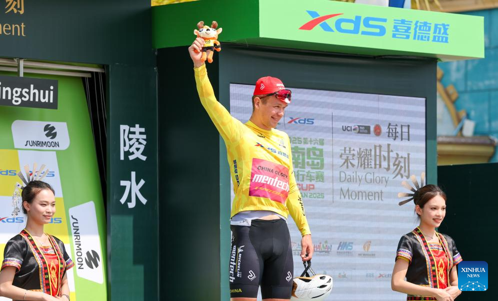 Norman Vahtra of China Glory-MENTECH Continental Cycling Team celebrates in the yellow jersey during the awarding ceremony after Stage 2 at the 16th Tour of Hainan cycling race from Qionghai to Lingshui, south China's Hainan Province, April 8, 2025. (Xinhua/Yang Guanyu)