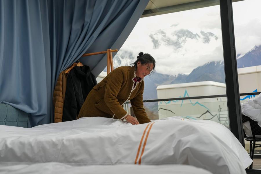 A staff member tidies up the room at a family inn in Nyingchi, southwest China's Xizang Autonomous Region, April 4, 2025.(Xinhua/Jigme Dorje)