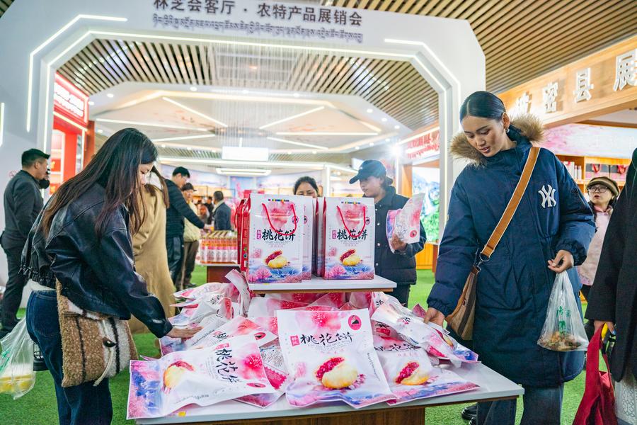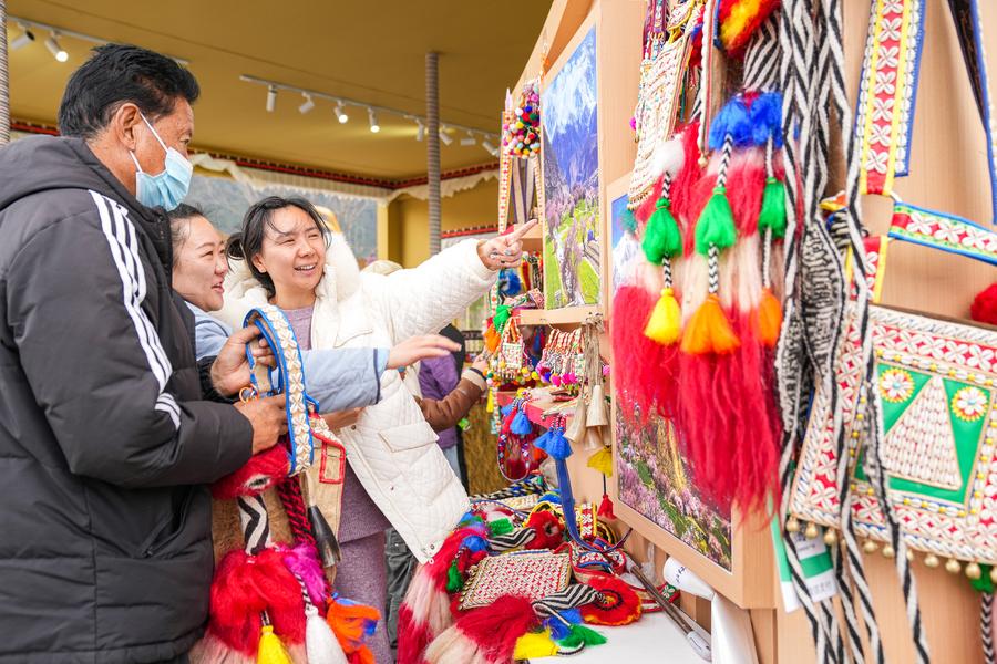 Tourists select souvenirs in Nyingchi, southwest China's Xizang Autonomous Region, April 3, 2025. (Xinhua/Tenzin Nyida)