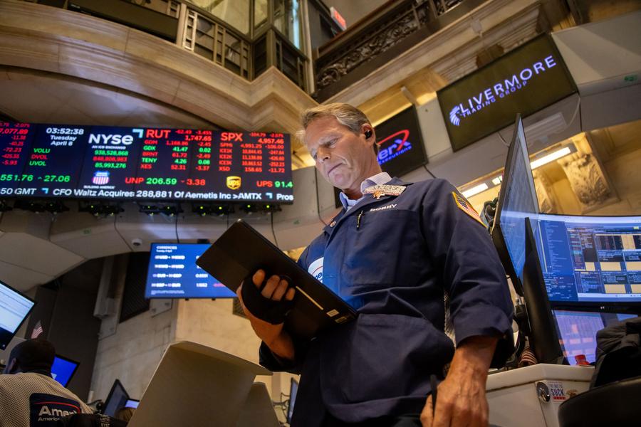 Traders work on the floor of the New York Stock Exchange in New York, the United States, on April 8, 2025. (Photo by Michael Nagle/Xinhua)