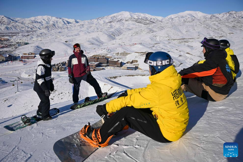 A foreign ski coach (2nd L) teaches at Jiangjunshan International Ski Resort in Altay, northwest China's Xinjiang Uygur Autonomous Region, Jan. 26, 2025. In recent years, with the abundant ice and snow resources of the Altay and Tianshan Mountains, Xinjiang are drawing increasing numbers of skiers and snowboarders, driven by China's expanding winter sports industry and ice-and-snow economy. A number of high-grade ski resorts have been constructed, attracting a large number of domestic and international tourists and gradually transforming ice and snow resources into economic benefits. (Xinhua/Hu Huhu)