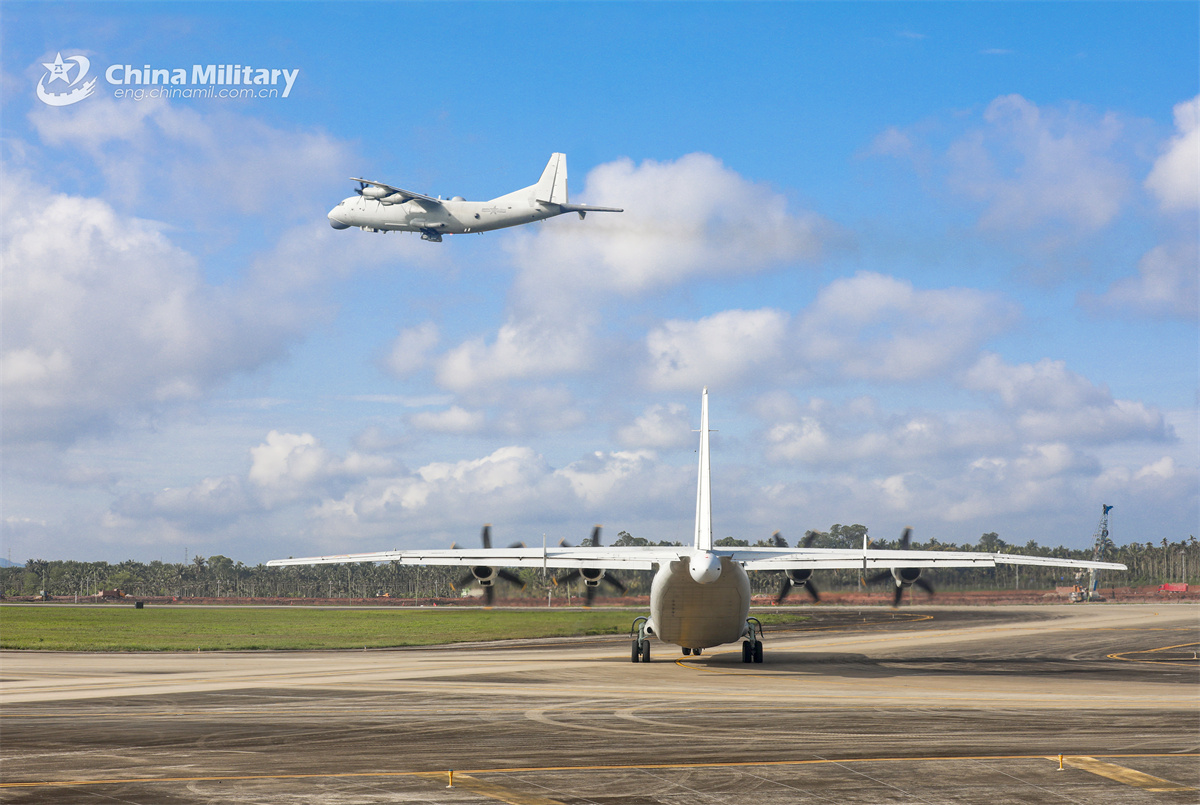 Y-9 medium-lift transport aircraft and Y-8 anti-submarine patrol aircraft attached to a regiment with the Chinese PLA Navy take off in succession during a multi-subject flight training exercise on March 24, 2025. (eng.chinamil.com.cn/Photo by Qin Qianjiang)