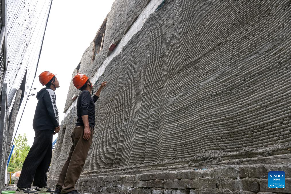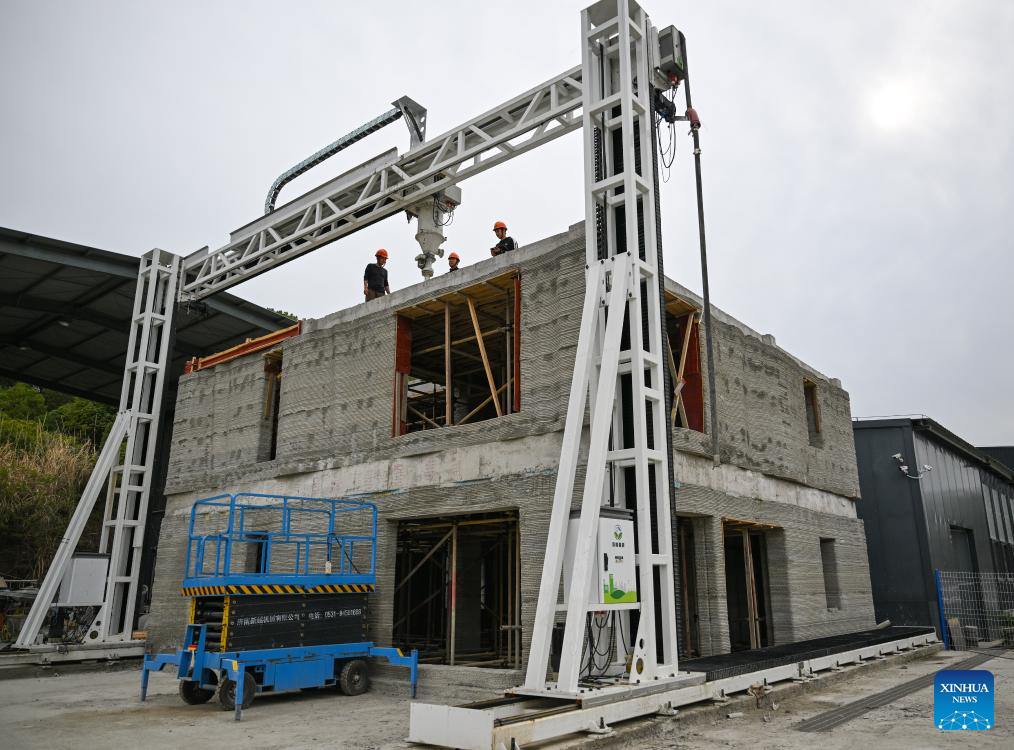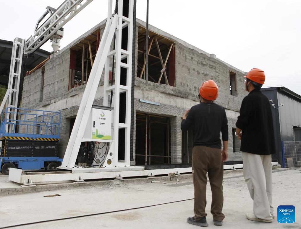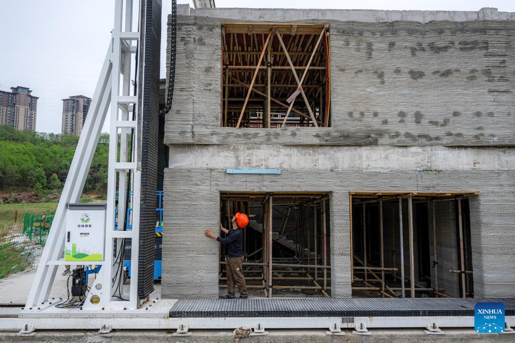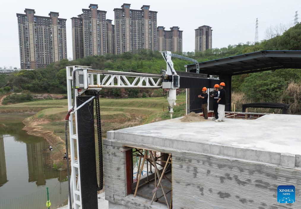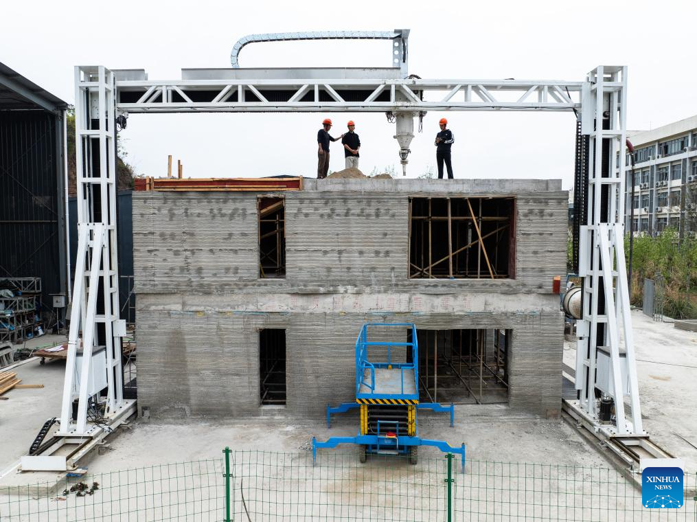 Constructors check an experimental building in Yichang, central China's Hubei Province, April 9, 2025. An 8-meter-tall and two-story building has completed its main structure in just 22 days during an architectural experiment conducted by a research team from China Three Gorges University. A house-building machine using 3D printing technology was used in the construction of the 100-square-meter experimental building. (Xinhua/Xiao Yijiu)
