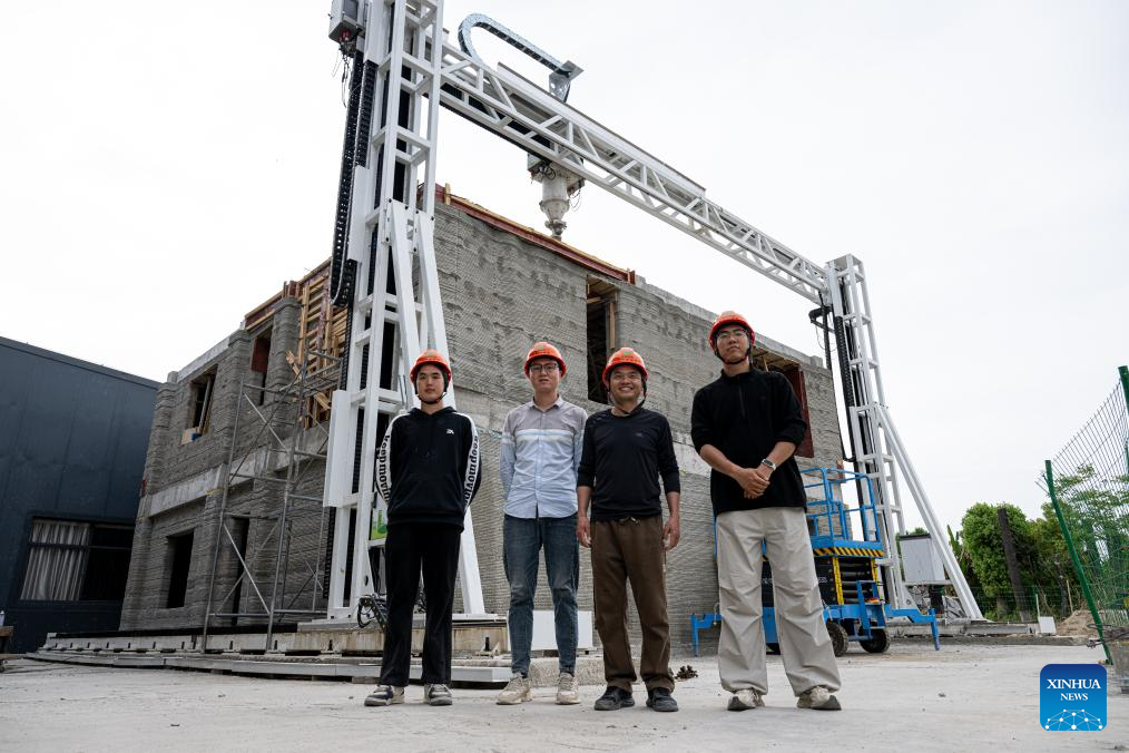 Constructors pose for a photo with an experimental building in Yichang, central China's Hubei Province, April 9, 2025. An 8-meter-tall and two-story building has completed its main structure in just 22 days during an architectural experiment conducted by a research team from China Three Gorges University. A house-building machine using 3D printing technology was used in the construction of the 100-square-meter experimental building. (Xinhua/Xiao Yijiu)