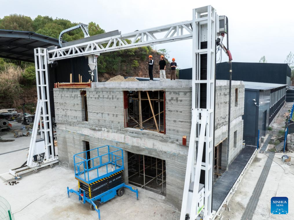 This photo taken on April 9, 2025 shows an experimental building in Yichang, central China's Hubei Province. An 8-meter-tall and two-story building has completed its main structure in just 22 days during an architectural experiment conducted by a research team from China Three Gorges University. A house-building machine using 3D printing technology was used in the construction of the 100-square-meter experimental building. (Xinhua/Du Zixuan)